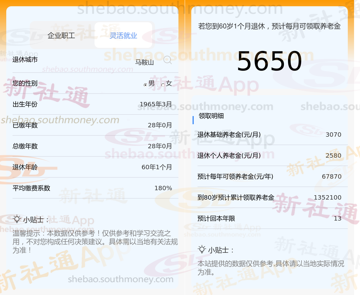 退休城市:马鞍山,性别:男,出生年份:1965,总缴年数28年,缴费档次:180%,新社通app养老金计算器所得: