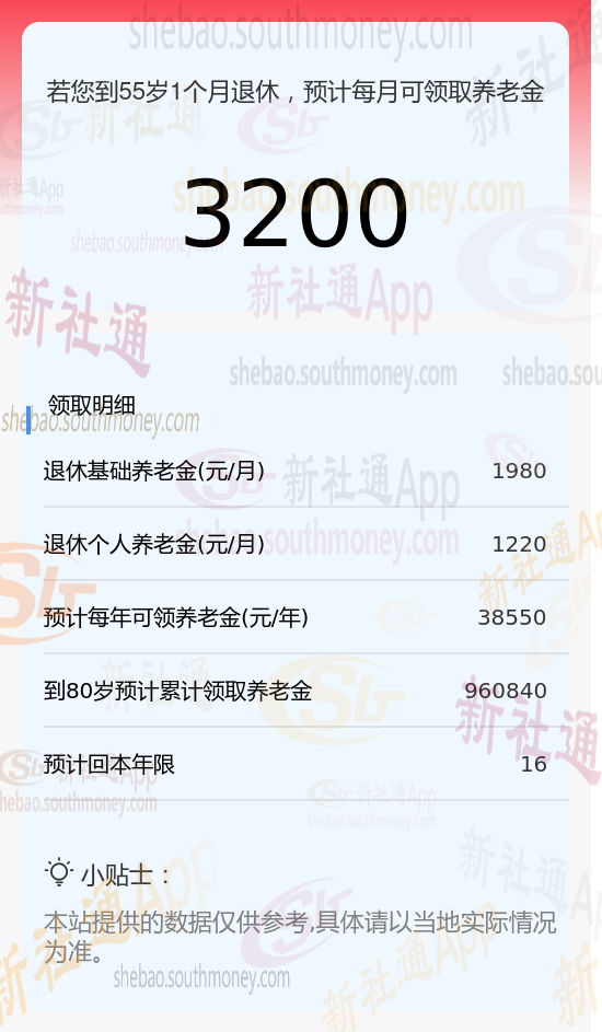 新社通app养老金计算器计算所得: