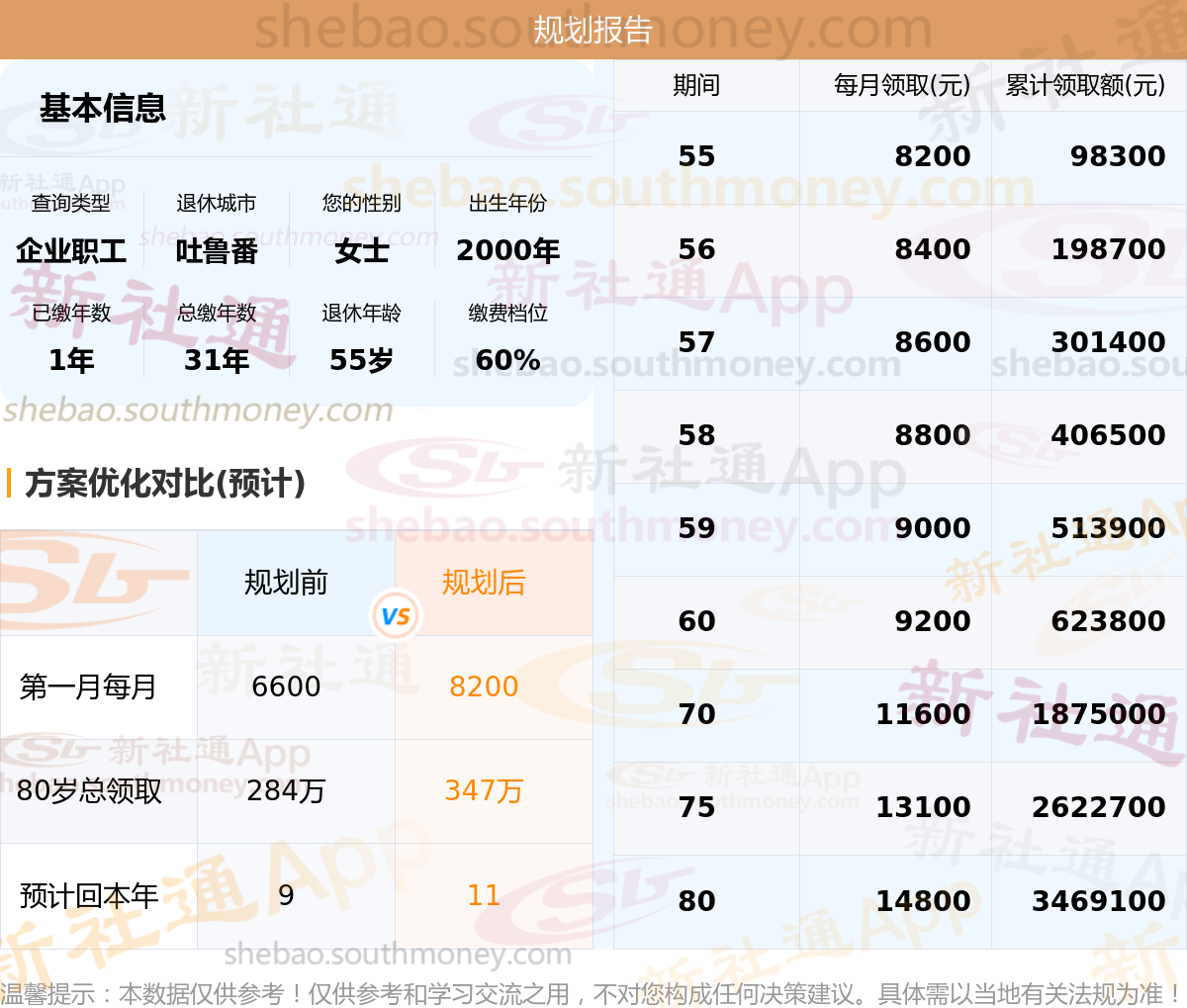 规划前:55岁养老金约6600元,新社通APP-养老金规划后:55岁养老金约8200元
