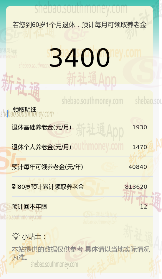 新社通app养老金计算器所得出,每月领取3400元养老金。