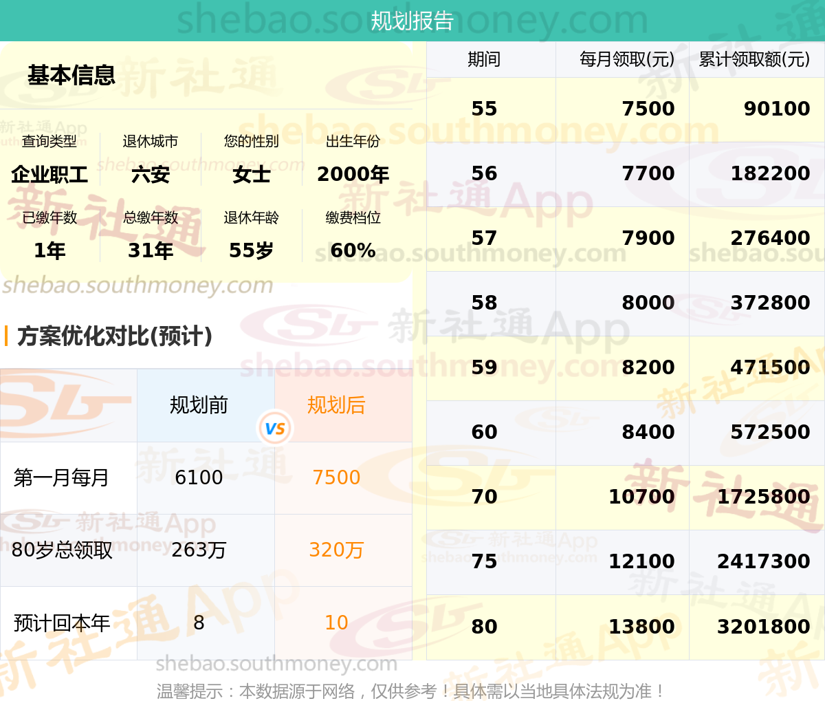 规划前:参保城市:六安,性别:女士,出生年月:2000,已缴年限:1年,总缴年数:31年,退休年龄:55岁,缴费档位:60%。
