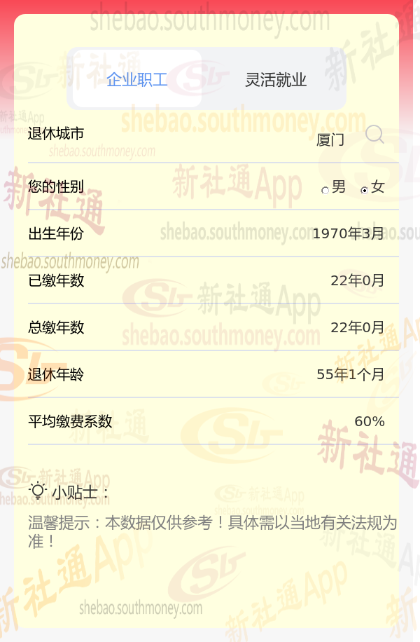 网友朱某退休城市在福建厦门,性别:女,出生年份:1970为例,假设其按最低标准(缴费系数0.6)缴纳社保,新社通app养老金计算器预设工资增长率等参数为3%。在此情境下,其退休后能领取的养老金数额需通过计算器精确得出,但基于上述条件,预计数额会相对较低。为获准确估算,建议朱某使用计算工具按要求输入个人信息进行计算,具体数额依个人情况及当地法规而定。