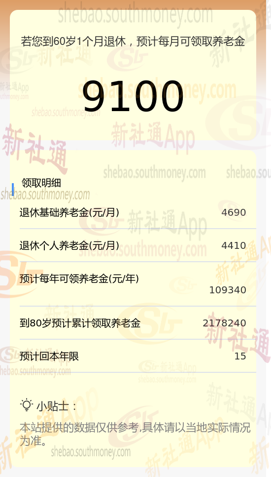沈某,湖州人,1965年出生,是一名拥有34载社保缴费年限的退休男性,缴费档次稳定在240%。岁月流转,他终于迎来了自己的退休时光。借助新社通app养老金在线计算器计算所得: