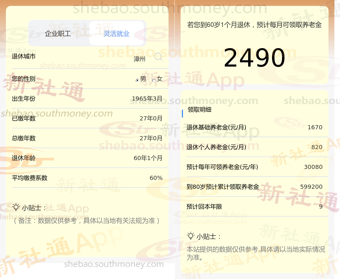 退休城市:漳州,性别:男,出生年份:1965,总缴年数27年,缴费档次:60%,新社通app养老金计算器所得: