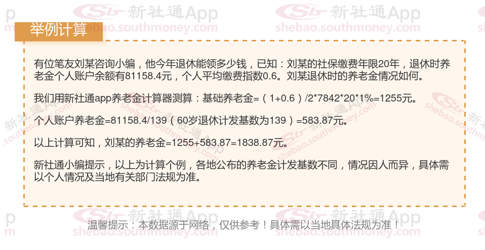 据新社通app养老金计算器测算显示,基础养老金=(1+0.6)/2*7842*30*1%=1882元。