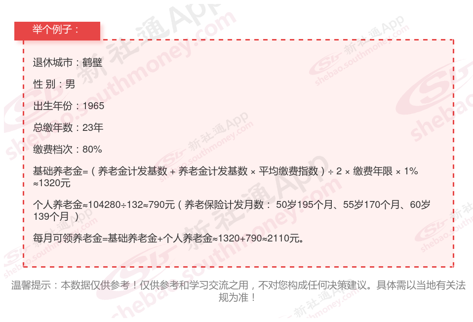 同事谢某退休城市在鹤壁,性别:男,出生年份:1965,总缴年数23年,缴费档次:80%,新社通app养老金计算器所得: