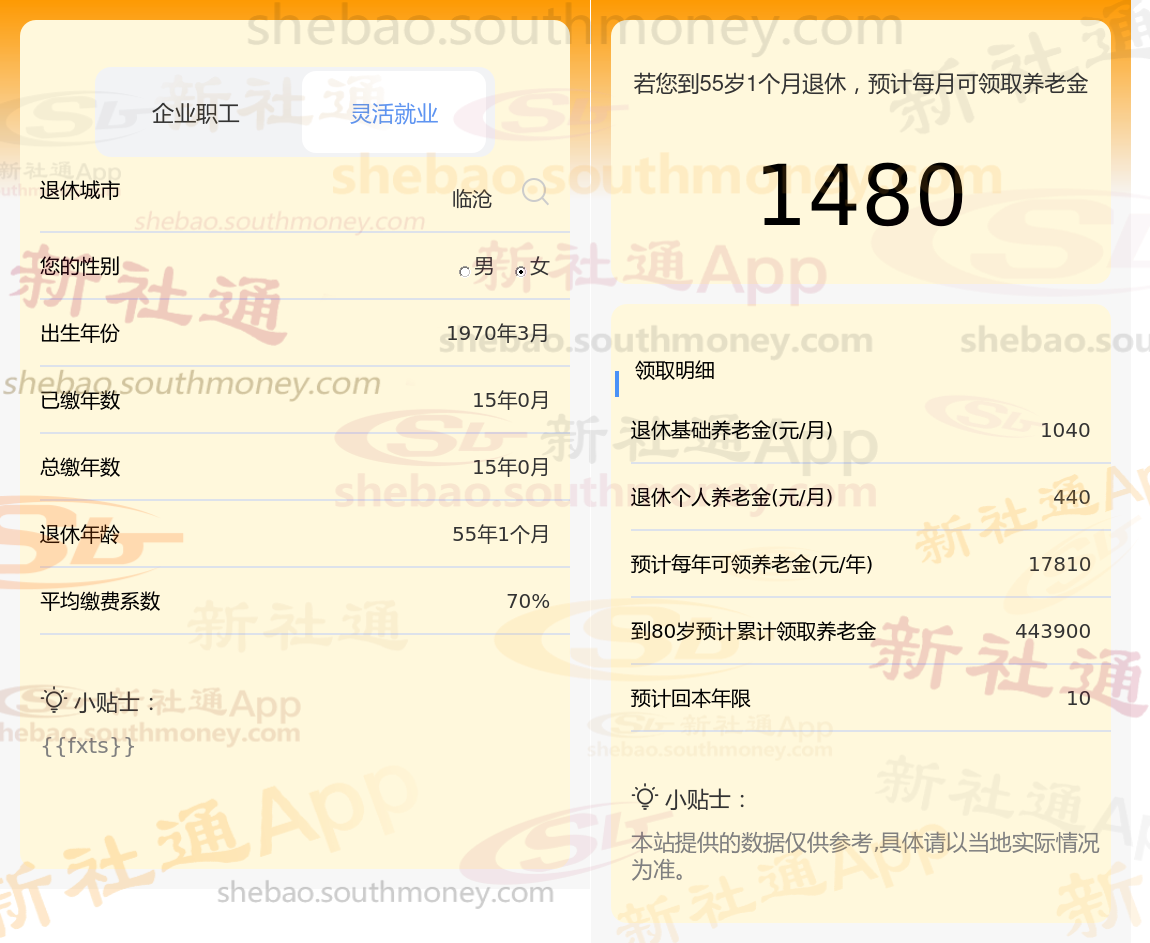 退休城市:临沧,性别:女,出生年份:1970,总缴年数15年,缴费档次:70%,新社通app养老金计算器所得: