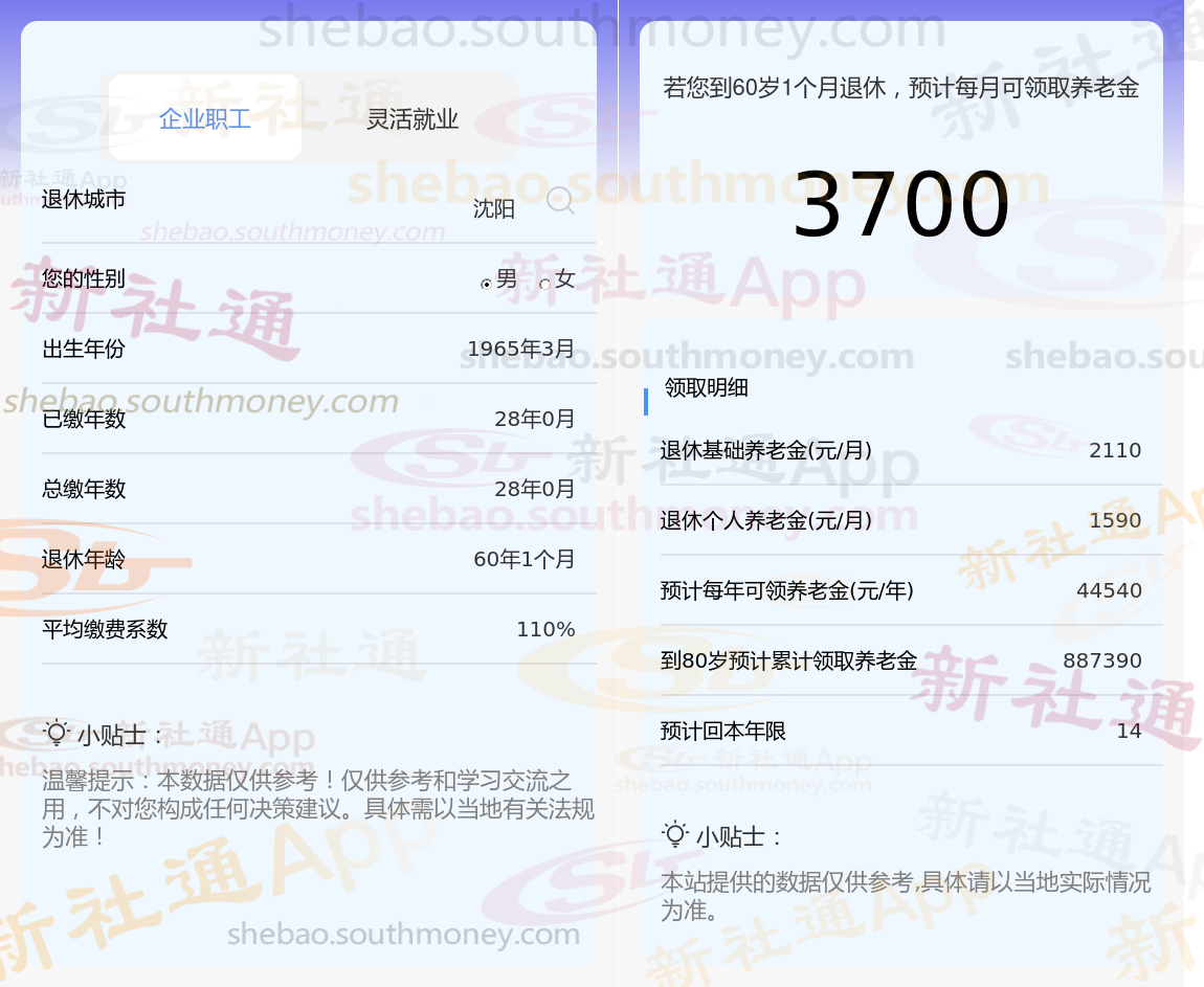 退休城市:辽宁沈阳,性别:男,出生年份:1965,总缴年数28年,缴费档次:110%