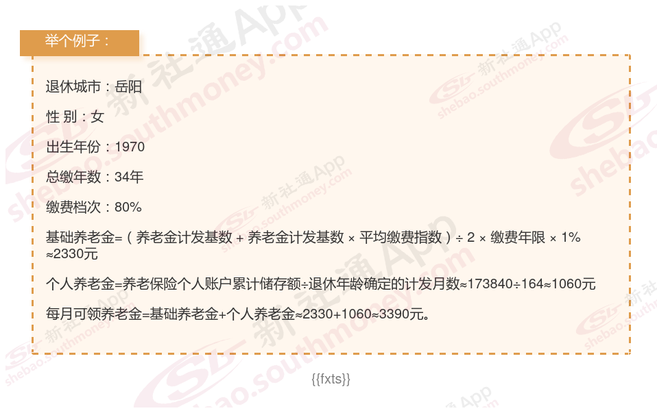 退休城市:岳阳,性别:女,出生年份:1970,总缴年数34年,缴费档次:80%