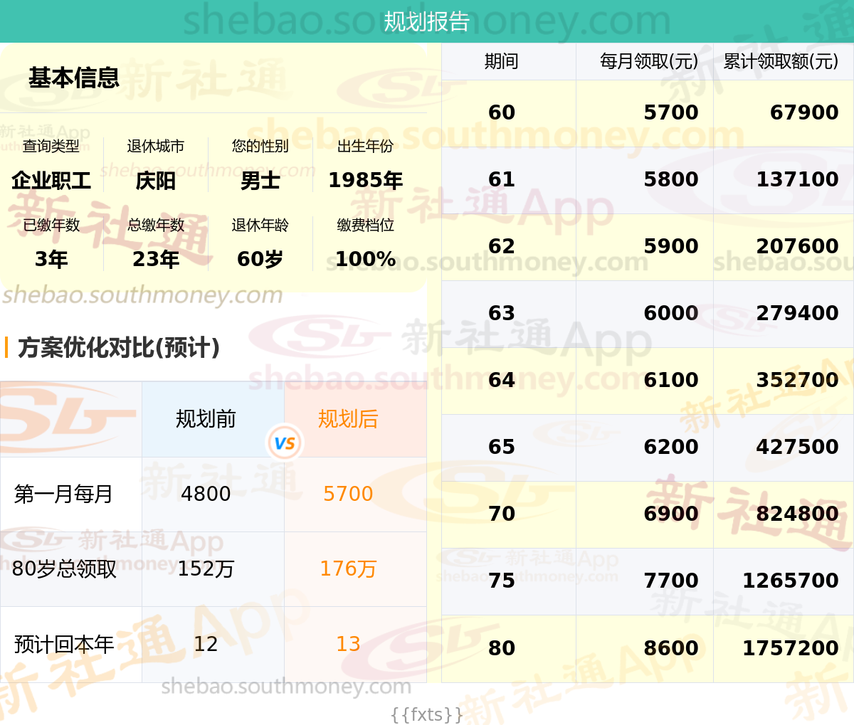 规划前:60岁第一个月约领4800元,新社通APP-养老金规划后:60岁第一个月约领5700元