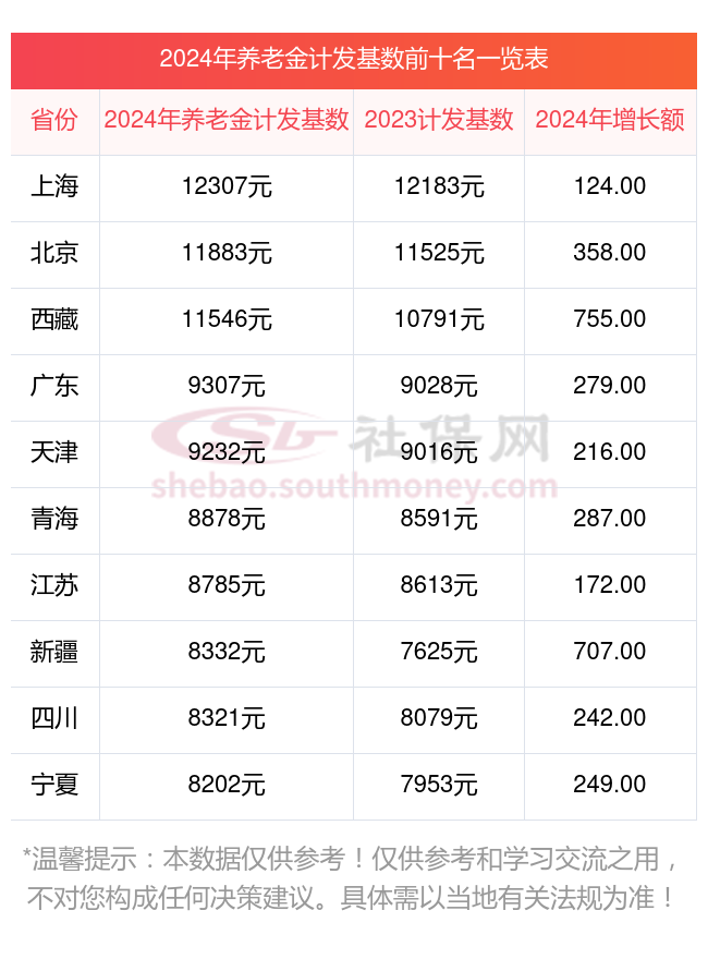 据新社通app显示,2024年上海位列第一位,养老金计发基数达到12307.00元,增长率为1.02%;北京排名第二,养老金计发基数为11883.00元,增长率为3.11%;西藏排名第三,养老金计发基数11546.00元,增长率为7.00%。排名前10的还有:广东、天津、青海、江苏、湖北、新疆、四川。