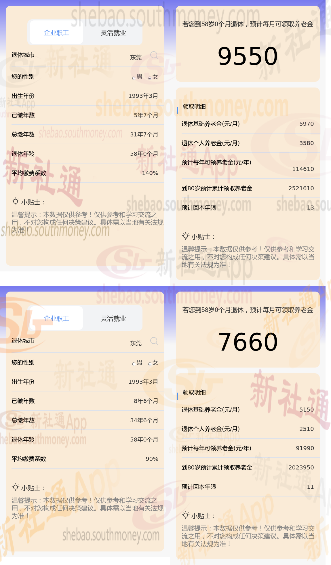 根据新社通app养老金计算器,轻松测算您的养老金!计算所得出:希某与老严的差别,缴费年限、缴费档位不同的情况下,差别9550-7660=1890元。