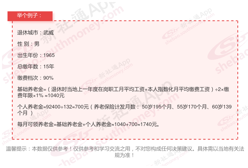 武威15年个人退休工资:个人账户养老金计算:个人账户养老金的计算方法是根据您个人账户中的储蓄金额除以缴费月数,缴费月数根据您的退休年龄确定。通过公式计算出每月大约700元。