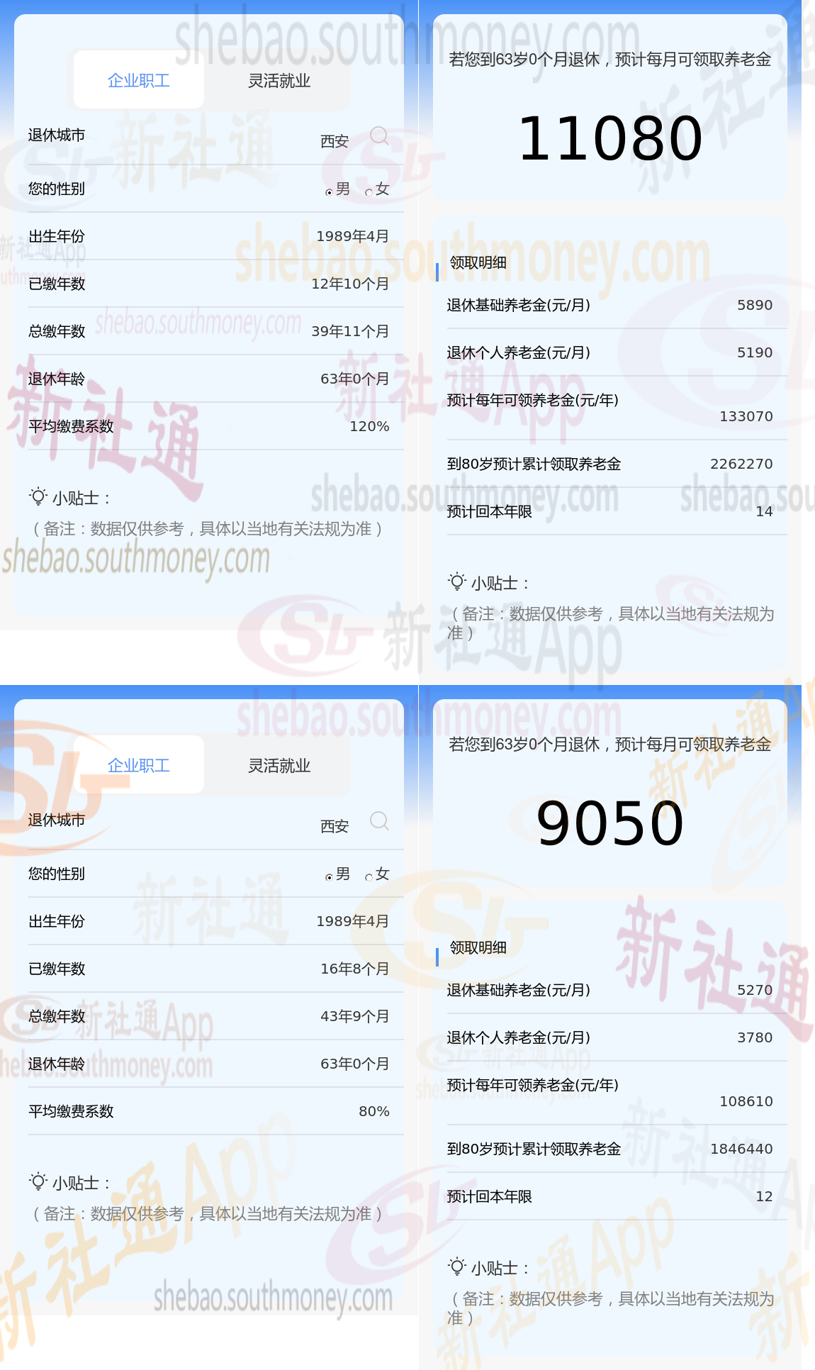 谢某:退休城市西安,社保缴费年限39年,63周岁退休,按120%缴费档位。