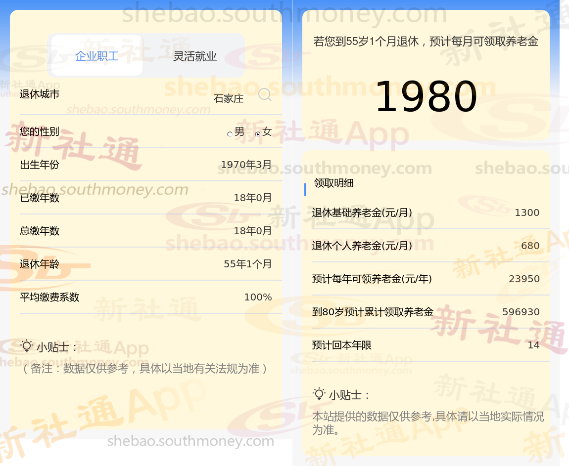 退休城市:河北石家庄,性别:女,出生年份:1970,总缴年数18年,缴费档次:100%,新社通app养老金计算器所得: