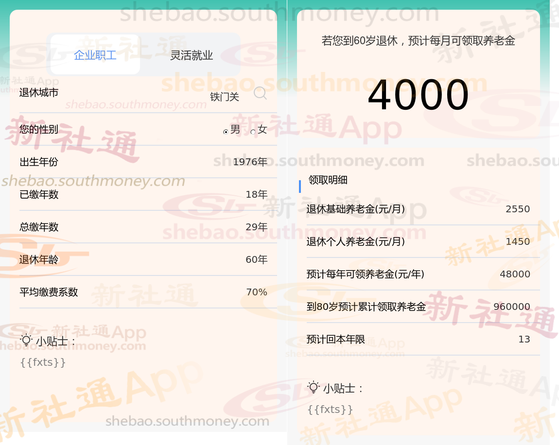 通过新社通APP-养老金计算所得:退休城市、出生年份、退休年龄、缴费系数都相同的情况下,社保缴费年限累计34年时,计算如下: