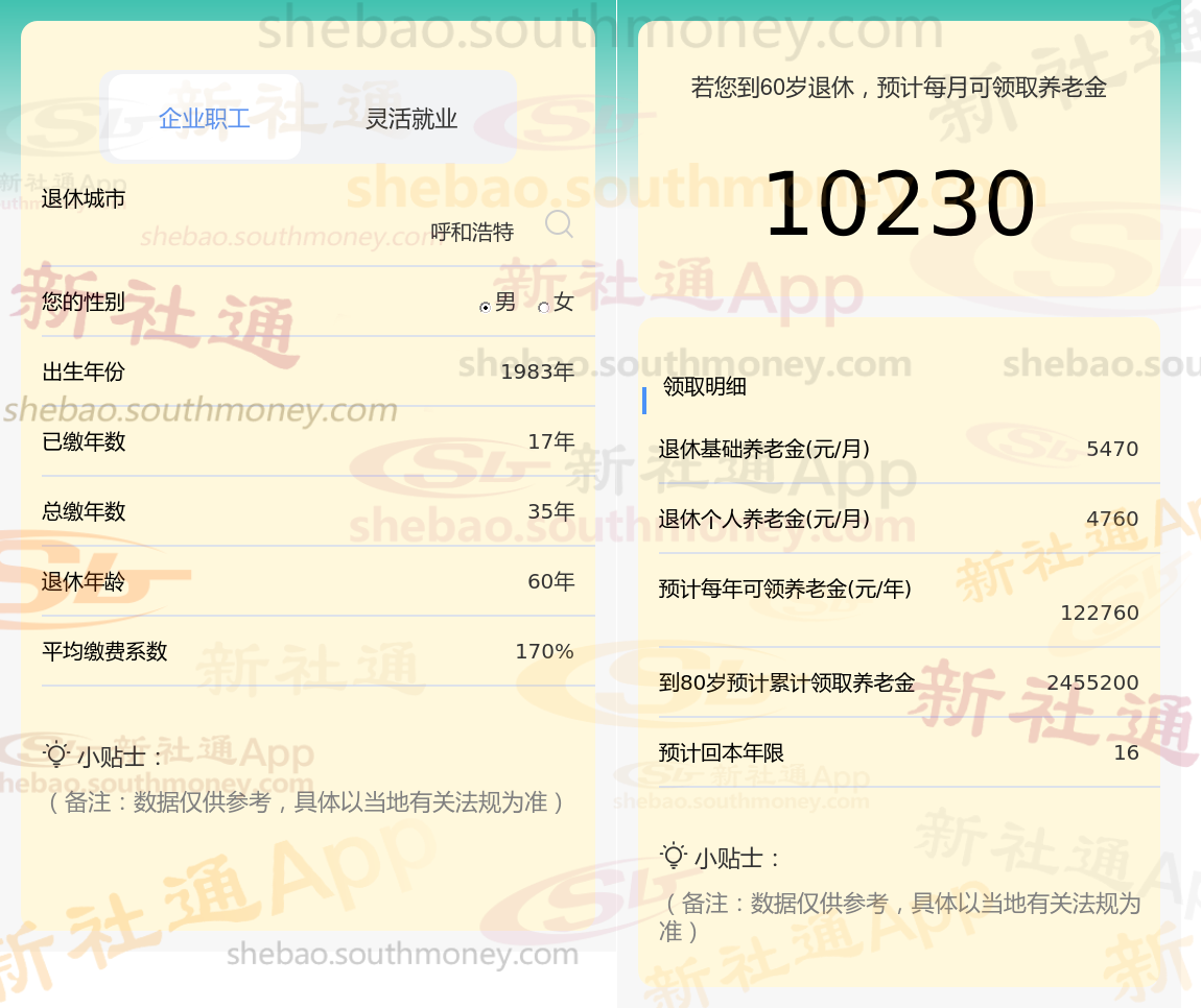 通过新社通APP-养老金计算所得:退休城市、出生年份、退休年龄、缴费系数都相同的情况下,社保缴费年限累计35年时,计算如下: