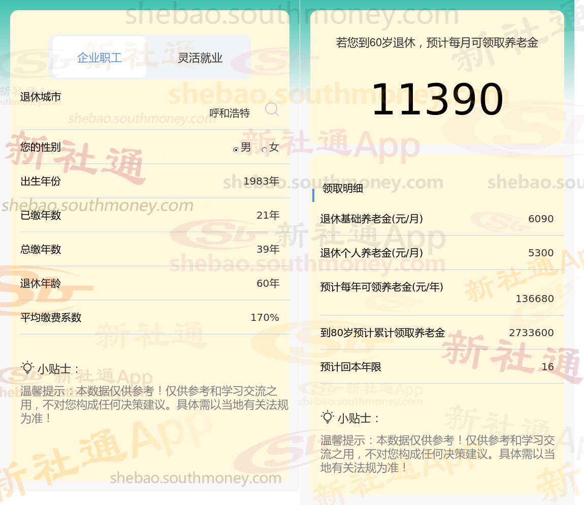 通过新社通APP-养老金计算所得:退休城市、出生年份、退休年龄、缴费系数都相同的情况下,社保缴费年限累计39年时,计算如下: