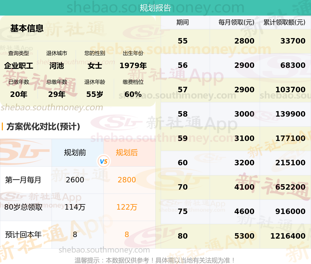 规划前:55岁第一个月约领2600元,新社通APP-养老金规划后:55岁第一个月约领2800元