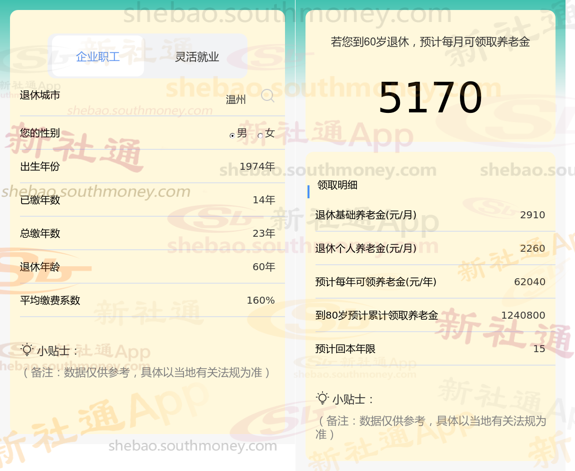 通过新社通APP-养老金计算所得:退休城市、出生年份、退休年龄、缴费系数都相同的情况下,社保缴费年限累计23年时,计算如下: