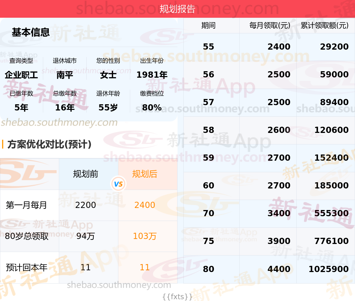 规划前:参保城市:南平,性别:女士,出生年月:1981,已缴年限:5年,总缴年数:16年,退休年龄:55岁,缴费档位:80%。