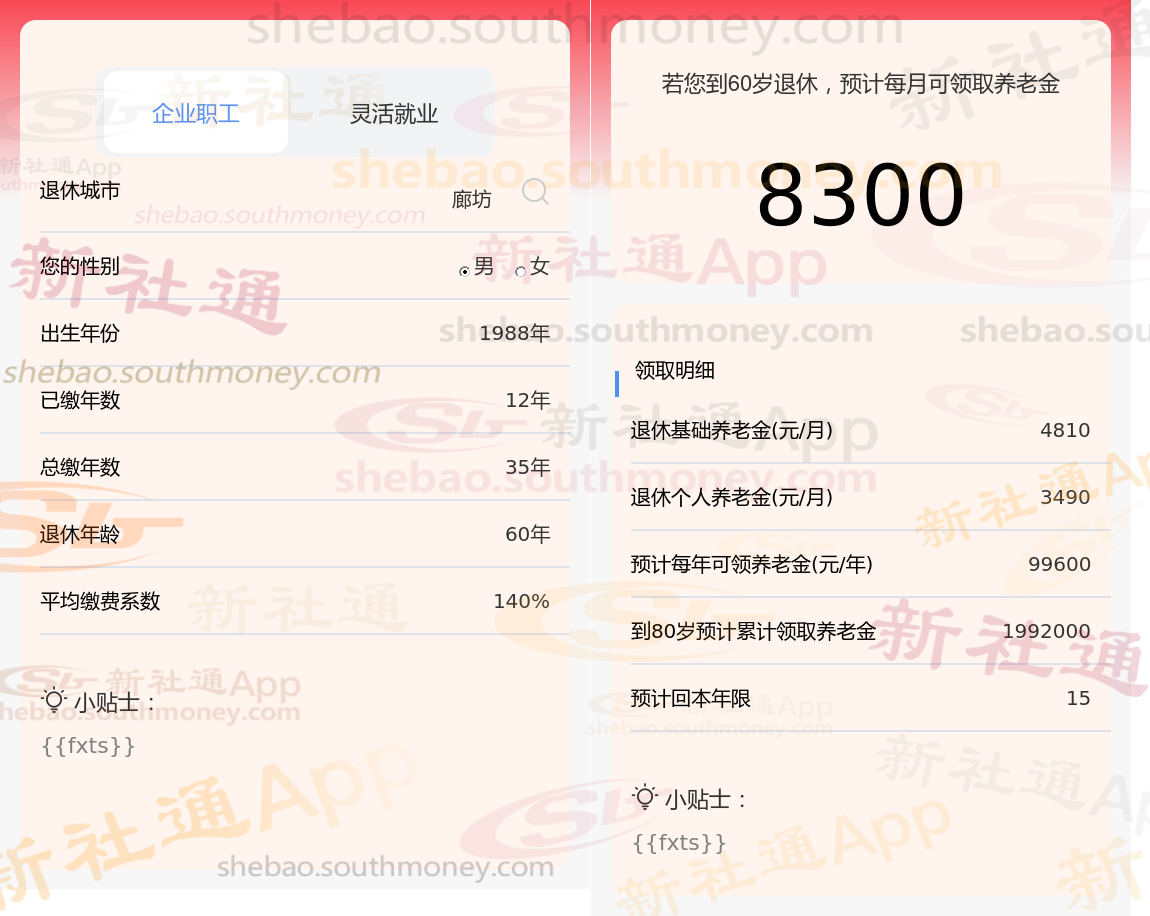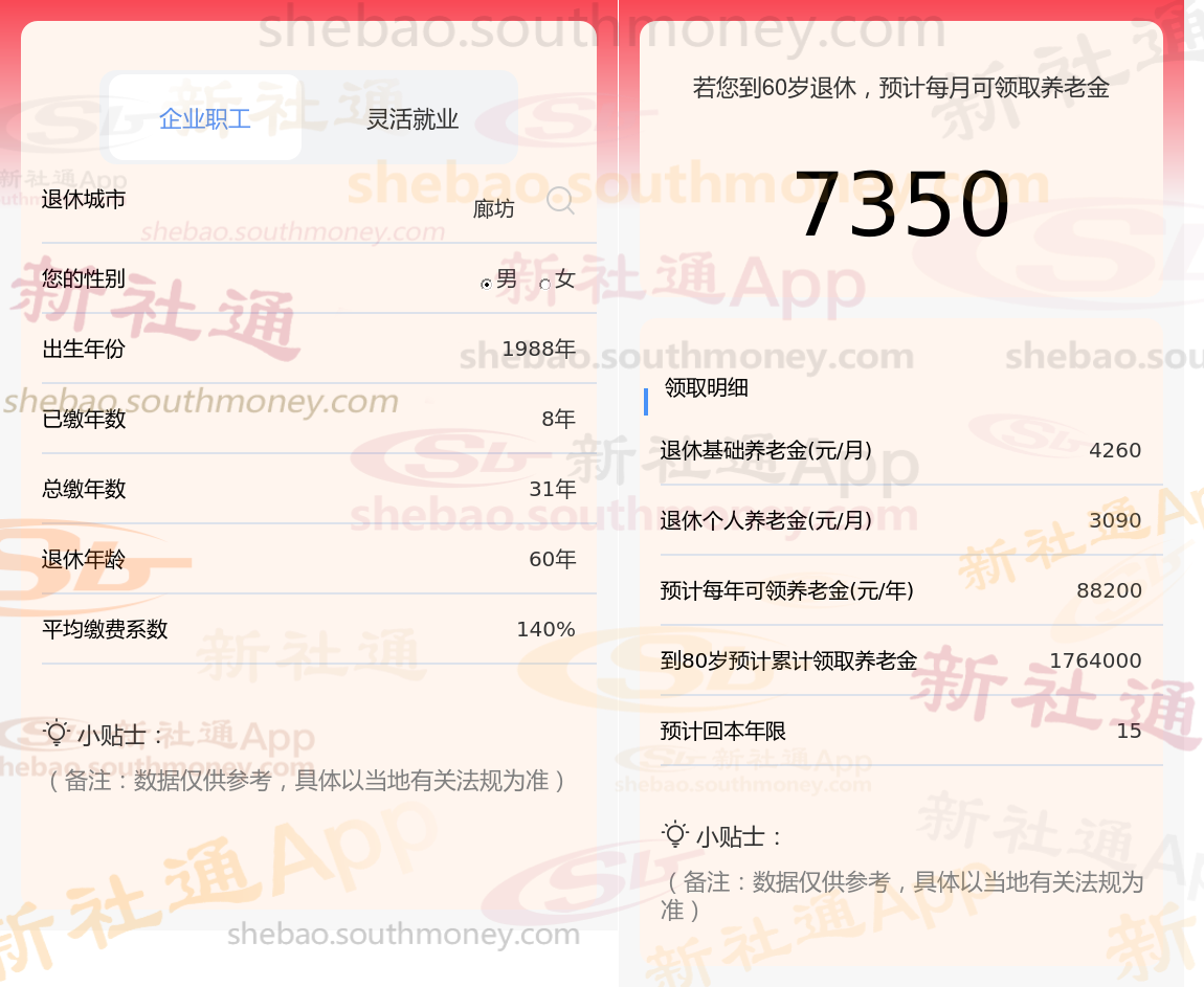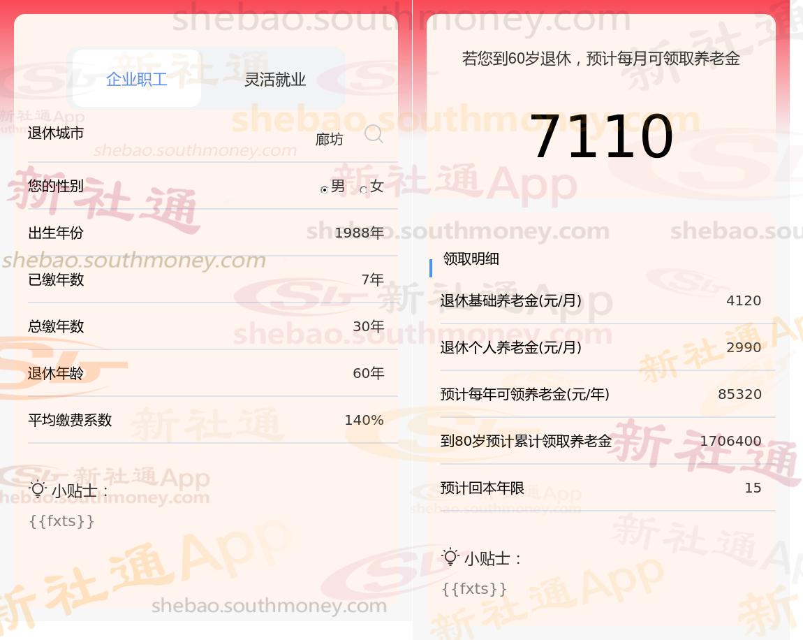 通过新社通APP-养老金计算所得:退休城市、出生年份、退休年龄、缴费系数都相同的情况下,社保缴费年限累计30年时,计算如下: