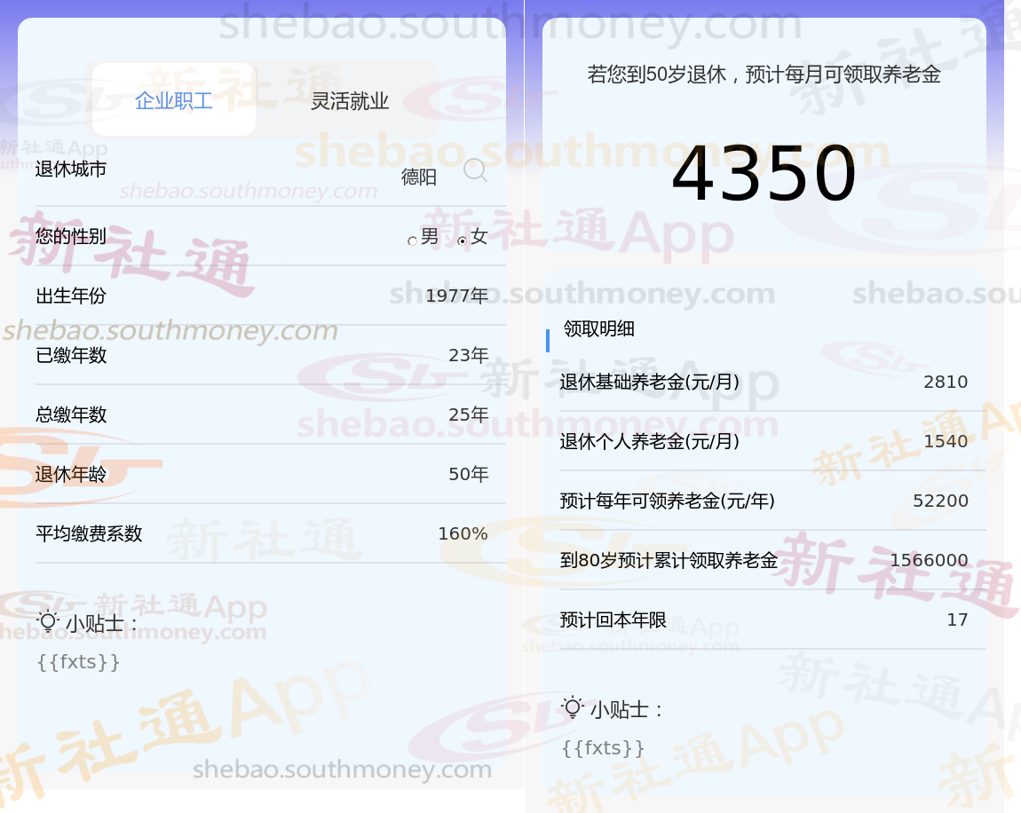 通过新社通APP-养老金计算所得:退休城市、出生年份、退休年龄、缴费系数都相同的情况下,社保缴费年限累计25年时,计算如下: