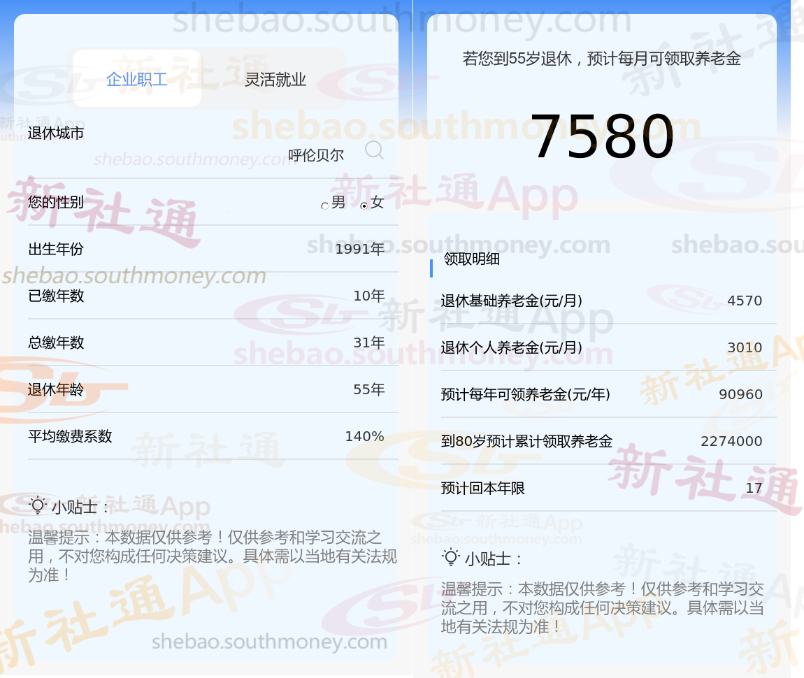 通过新社通APP-养老金计算所得:退休城市、出生年份、退休年龄、缴费系数都相同的情况下,社保缴费年限累计31年时,计算如下: