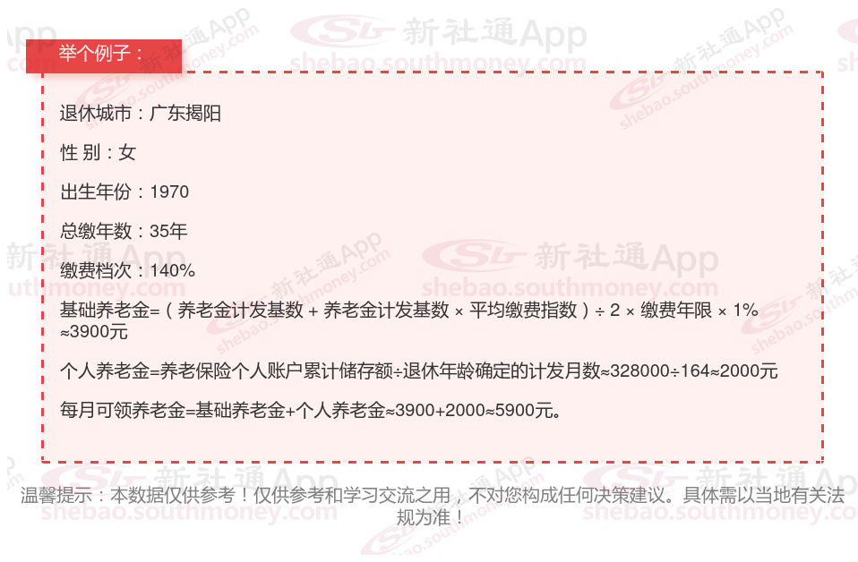 总养老金金额:两者合计,您每月可领取的养老金待遇总额为5900元/月。