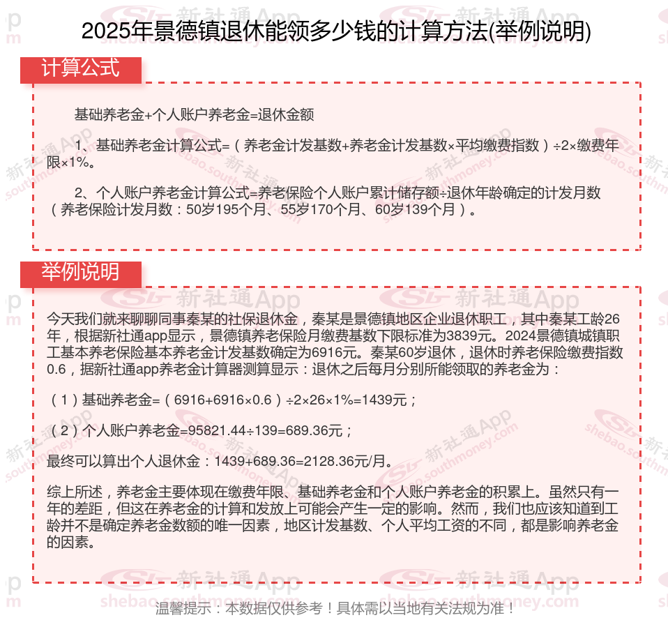 为了更加精确地了解自己未来每月能够领取的养老金金额,我们需要深入了解并掌握养老金的计算方法通过了解养老金的计算方式和影响因素,我们可以更好地规划自己的退休生活,确保生活质量不会因为退休而大幅下降。那么,社保交退休,每月能领取多少钱的养老金?下面随新社通app小编一起来看看景德镇2025年养老金计算公式。