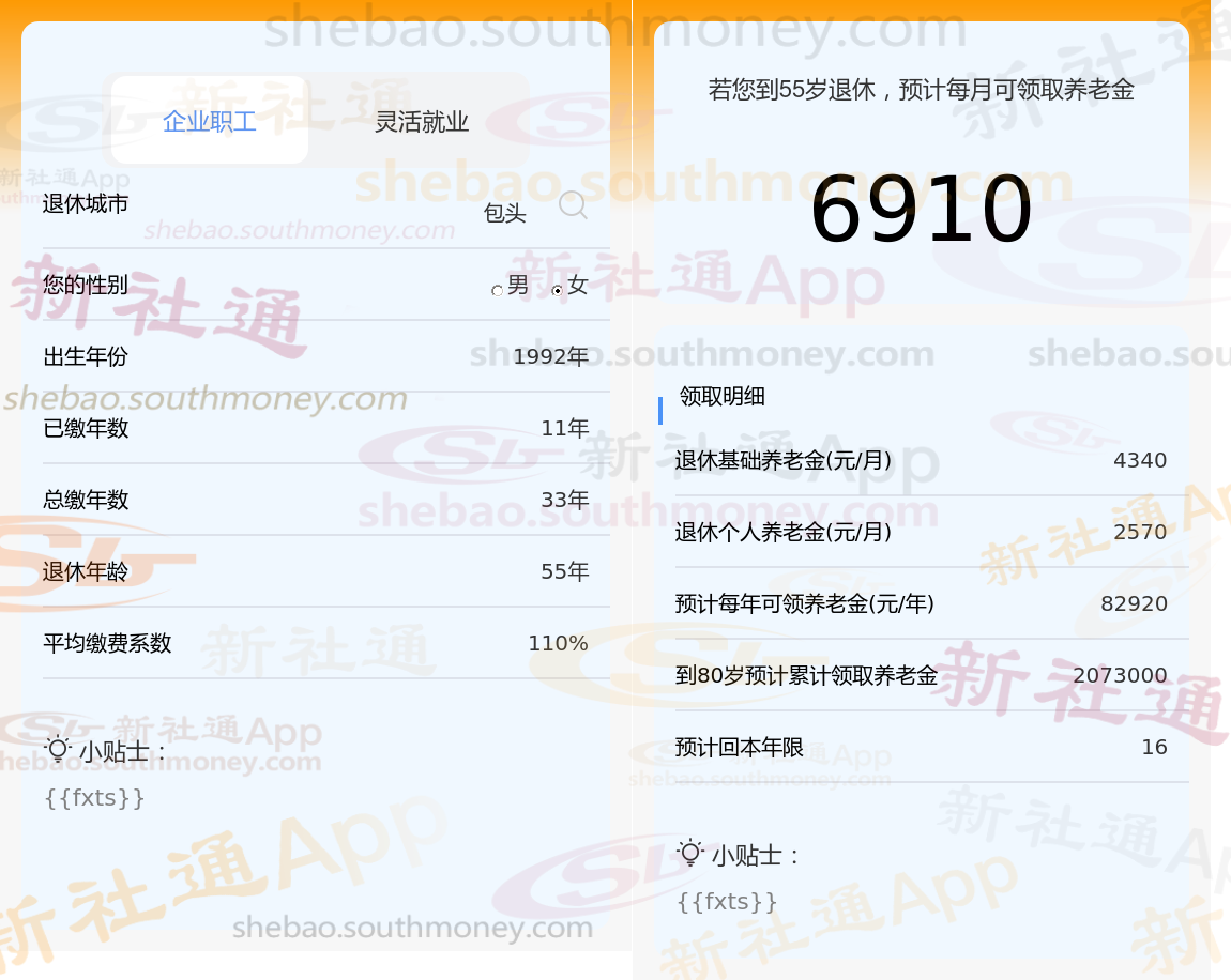 通过新社通APP-养老金计算所得:退休城市、出生年份、退休年龄、缴费系数都相同的情况下,社保缴费年限累计33年时,计算如下: