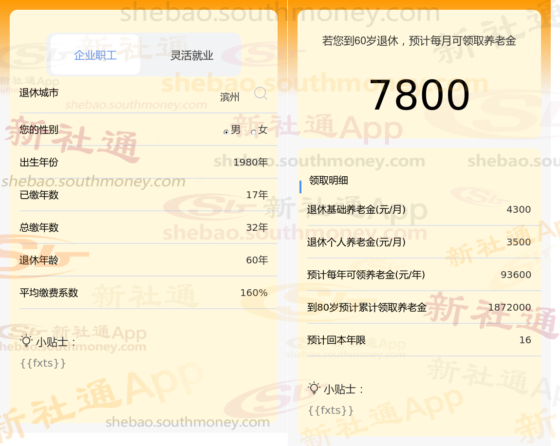 通过新社通APP-养老金计算所得:退休城市、出生年份、退休年龄、缴费系数都相同的情况下,社保缴费年限累计32年时,计算如下: