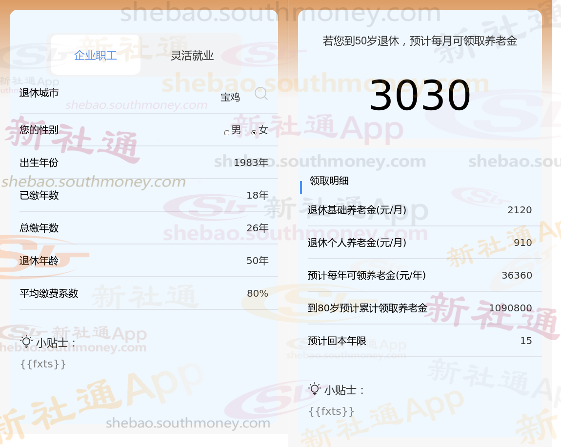 通过新社通APP-养老金计算所得:退休城市、出生年份、退休年龄、缴费系数都相同的情况下,社保缴费年限累计26年时,计算如下: