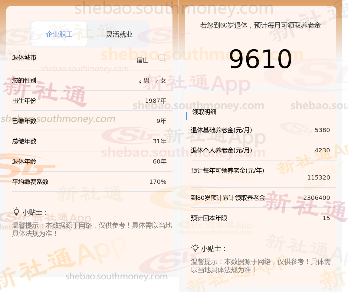 通过新社通APP-养老金计算所得:退休城市、出生年份、退休年龄、缴费系数都相同的情况下,社保缴费年限累计31年时,计算如下: