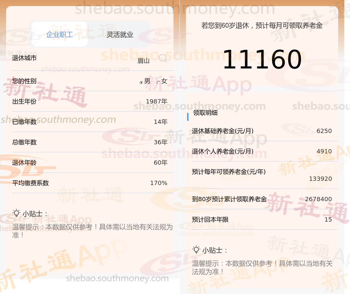 通过新社通APP-养老金计算所得:退休城市、出生年份、退休年龄、缴费系数都相同的情况下,社保缴费年限累计36年时,计算如下: