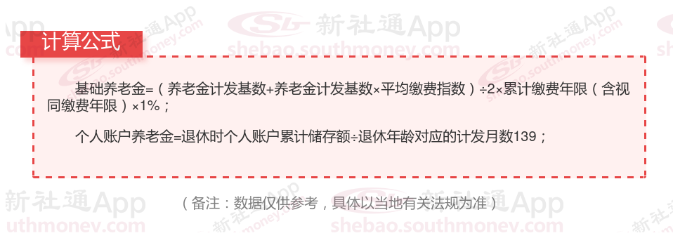 计算公式:基础养老金=退休上年度社会平均工资×(1+本人平均缴费指数)÷2×缴费年限×1%。