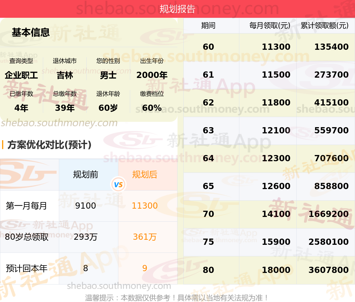 规划前:60岁退休后约领9100元,规划后:60岁退休后约领11300元