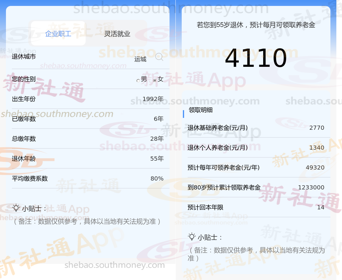 通过新社通APP-养老金计算所得:退休城市、出生年份、退休年龄、缴费系数都相同的情况下,社保缴费年限累计33年时,计算如下: