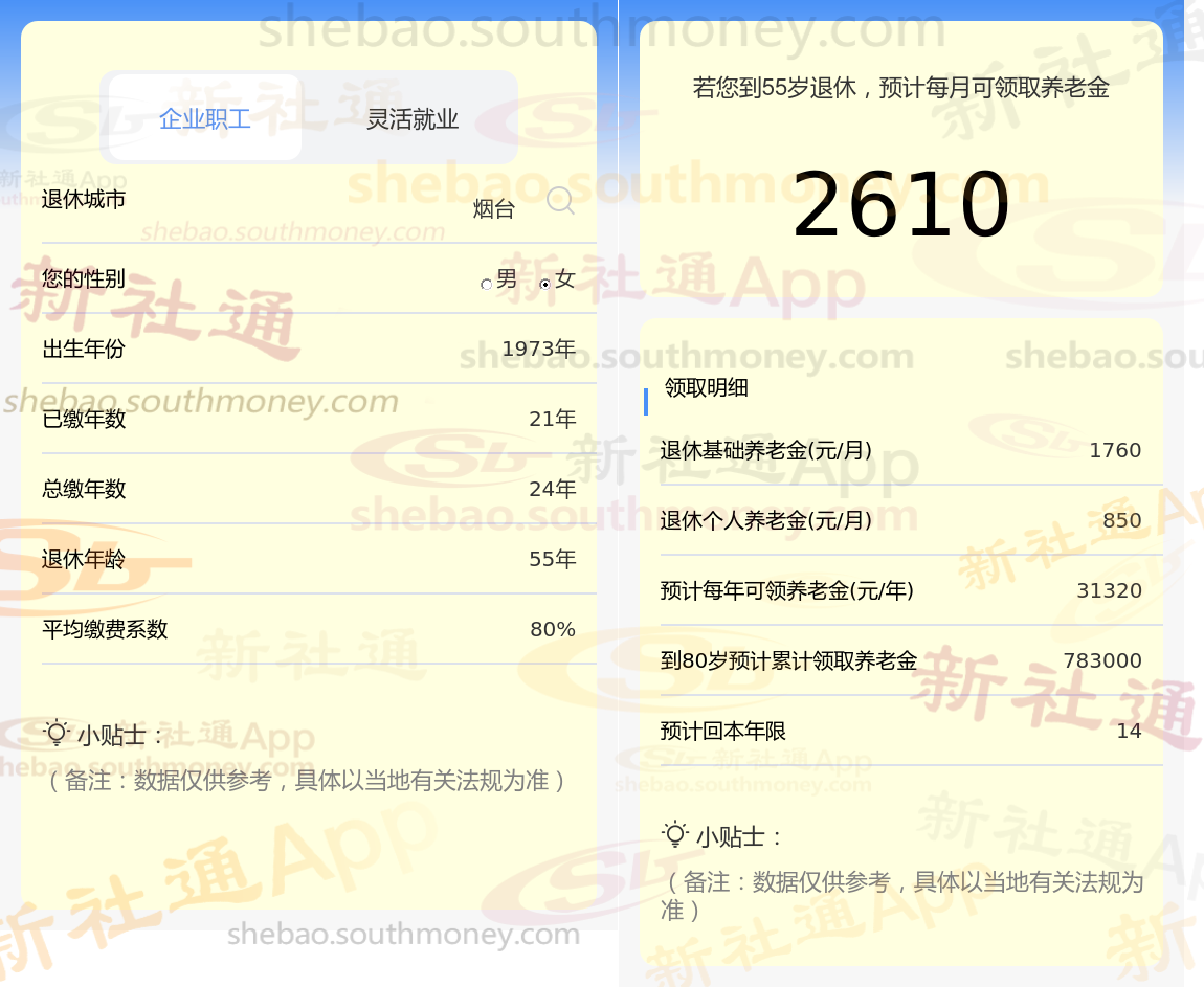 通过新社通APP-养老金计算所得:退休城市、出生年份、退休年龄、缴费系数都相同的情况下,社保缴费年限累计24年时,计算如下: