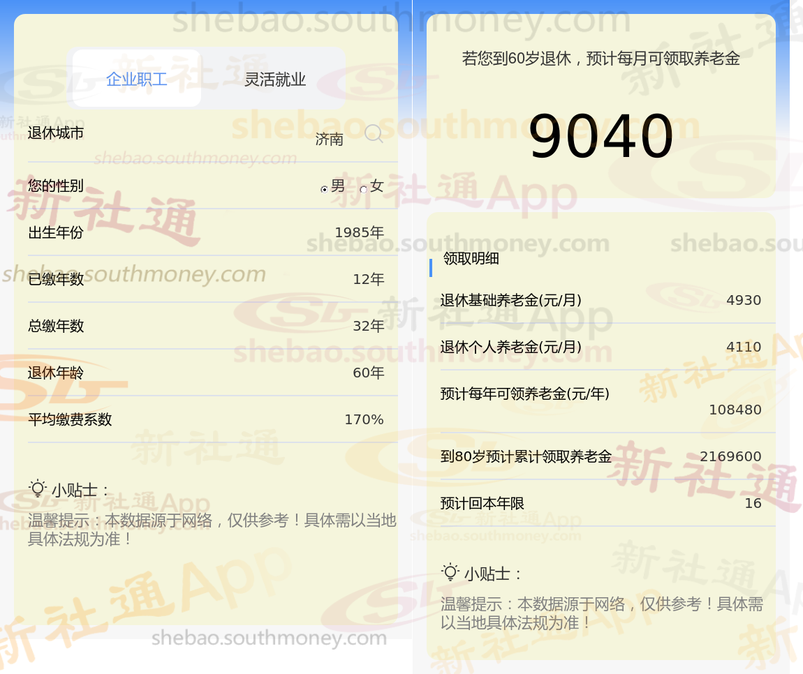 通过新社通APP-养老金计算所得:退休城市、出生年份、退休年龄、缴费系数都相同的情况下,社保缴费年限累计32年时,计算如下: