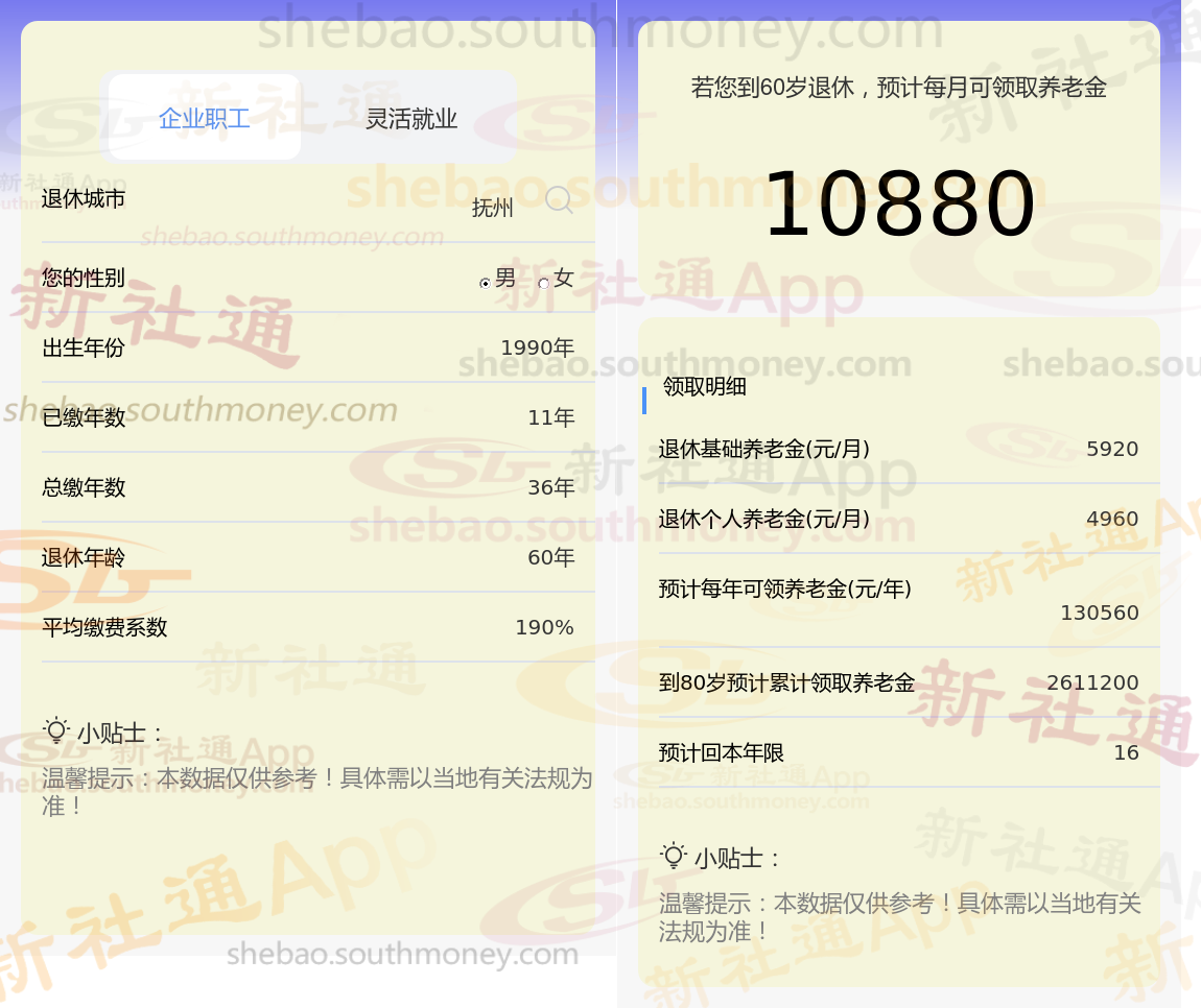 通过新社通APP-养老金计算所得:退休城市、出生年份、退休年龄、缴费系数都相同的情况下,社保缴费年限累计36年时,计算如下:
