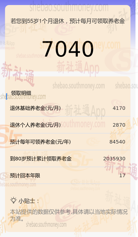 新社通app养老金计算器计算所得:
