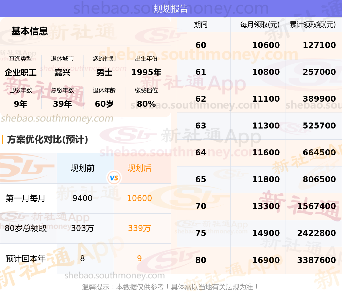 规划前:60岁第一个月退休金约9400元,新社通APP-养老金规划后:60岁第一个月退休金约10600元
