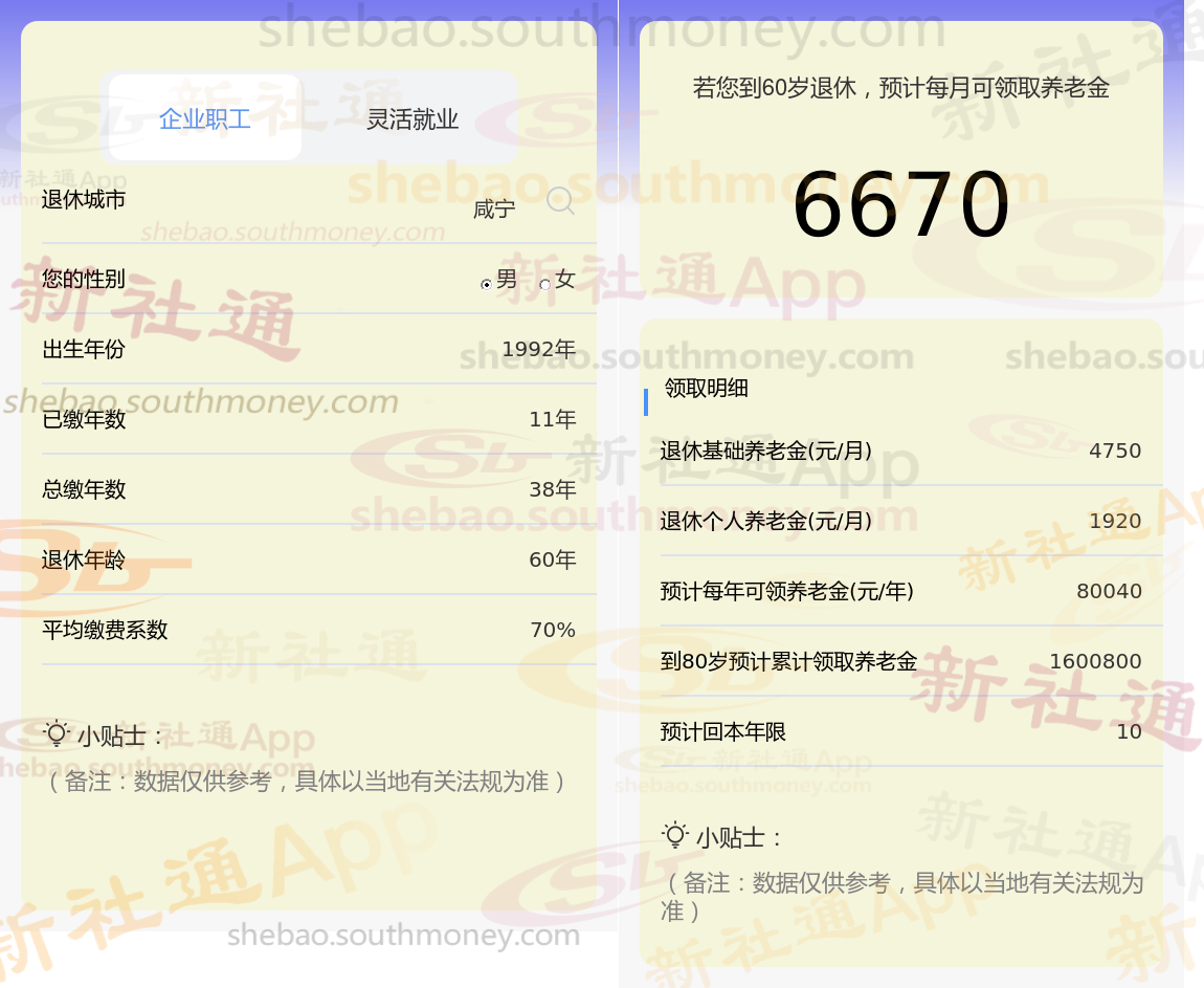 通过新社通APP-养老金计算所得:退休城市、出生年份、退休年龄、缴费系数都相同的情况下,社保缴费年限累计38年时,计算如下: