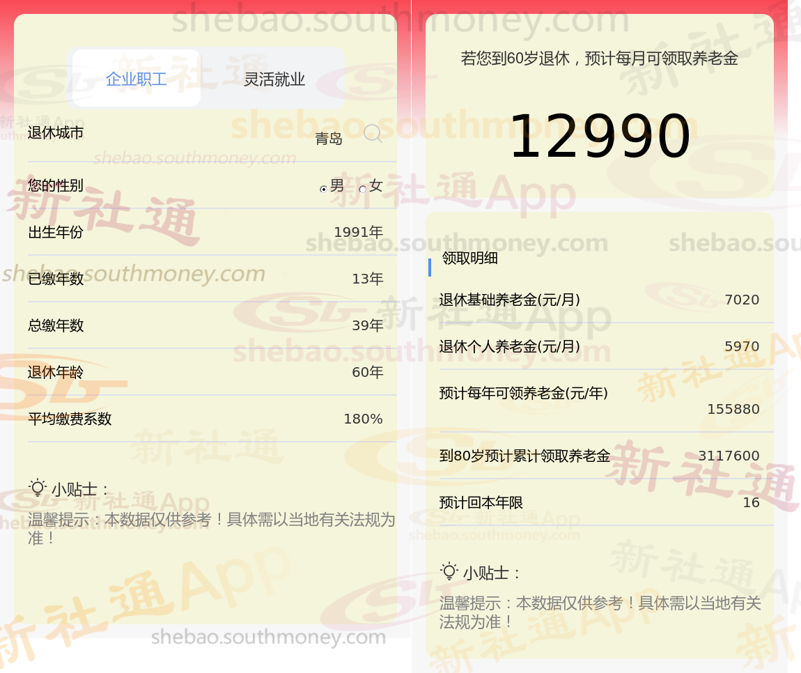 通过新社通APP-养老金计算所得:退休城市、出生年份、退休年龄、缴费系数都相同的情况下,社保缴费年限累计40年时,计算如下: