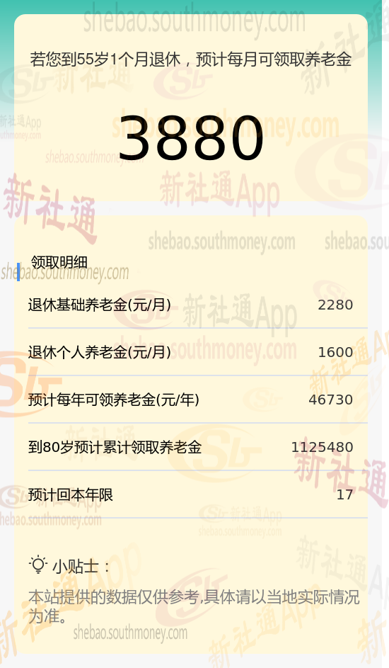 基于这些关键信息,我们使用新社通app养老金计算器对他未来的养老金进行了详细估算: