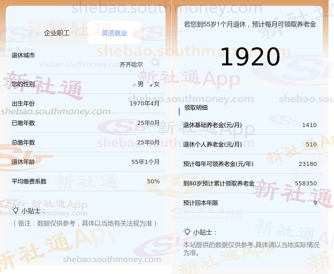 退休城市:齐齐哈尔,性别:女,出生年份:1970,总缴年数25年,缴费档次:50%,新社通app养老金计算器所得: