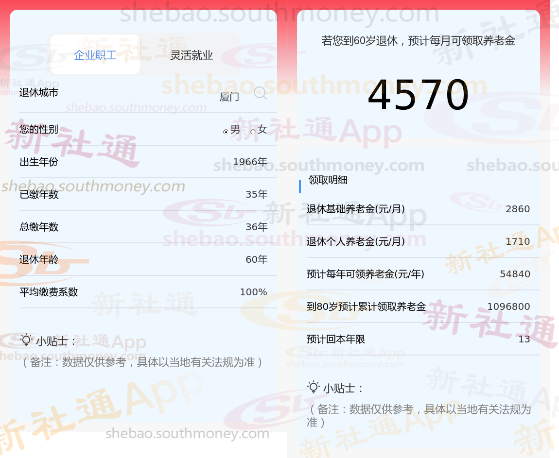 通过新社通APP-养老金计算所得:退休城市、出生年份、退休年龄、缴费系数都相同的情况下,社保缴费年限累计36年时,计算如下: