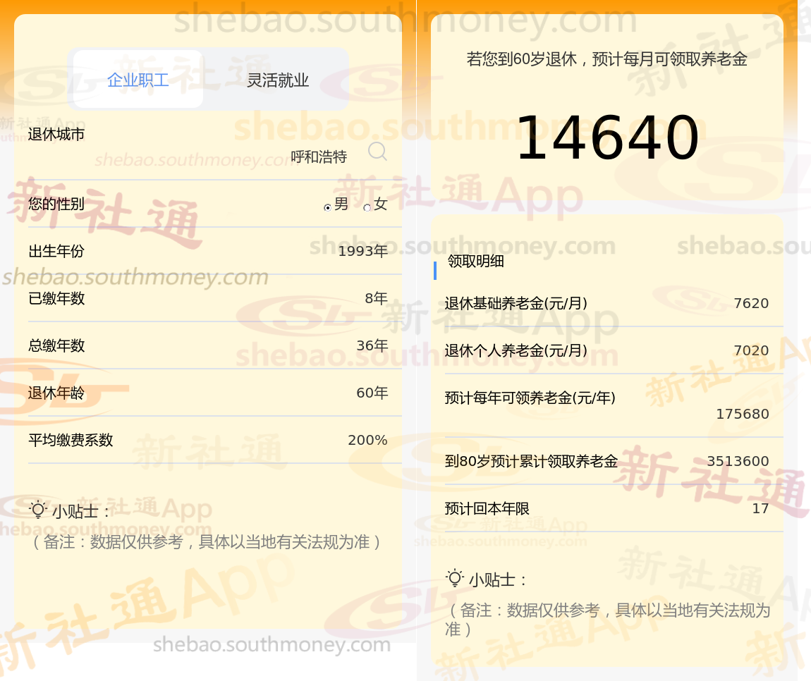 通过新社通APP-养老金计算所得:退休城市、出生年份、退休年龄、缴费系数都相同的情况下,社保缴费年限累计36年时,计算如下: