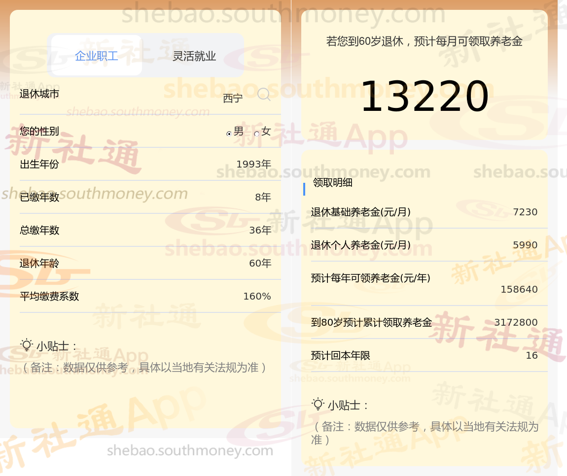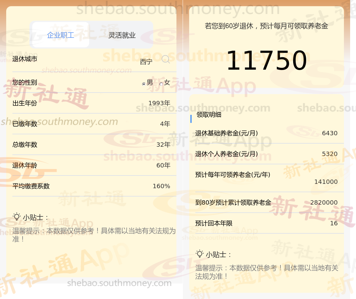 通过新社通APP-养老金计算所得:退休城市、出生年份、退休年龄、缴费系数都相同的情况下,社保缴费年限累计32年时,计算如下: